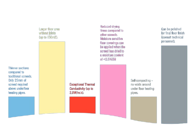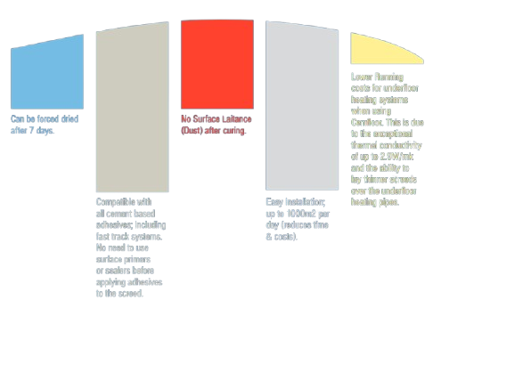 Compared with other liquid screeds which generally need to be force dried with underfloor heating; Cemfloor screeds can be used in non heated floors as it doesn't require force drying to remove moisture. Using the correct tile adhesives; tiles can be placed in as little as 5 days in non- heated floors.